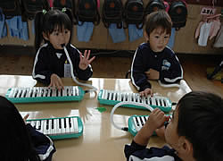 ピアニカ、今日は、指を当てて、吹いてみました。お父さん指で「ド」。 |