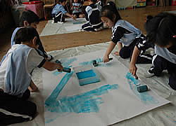 壁面製作の一部に、ローラーの活動は、子ども達も大好きです。 |