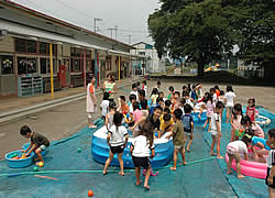 「午後から水遊びをするよ!」というと昼食の時間もいつもより早めに食べ終わる子が多く、 |