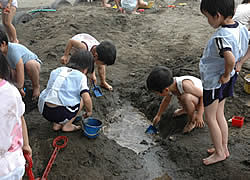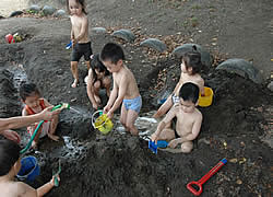 今日は、午後は、年長と年中が交互に水遊びを実施しました。気温も上がり、太陽がそれほど直接照らさない絶好の環境の中、こども達は、思いっきり水遊びを楽しんでいました。 |