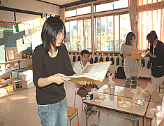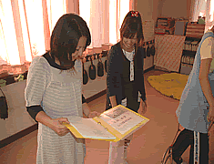 毎回、実習生が教育実習を終えると、ささやかですが、 お菓子と飲み物を準備して反省を兼ねて、お疲れさん会を実施しています。 一生懸命に汗をかいて書き上げた実習ノート、実習生にとっては、想いのあるノートです。 担当教諭から手渡しで渡しています。 |