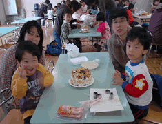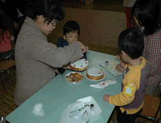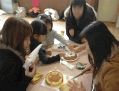 自分で飾り付けをしたケーキのお味はいかが? どのテーブルも和気あいあい、 楽しい雰囲気です。 |