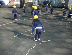 年長の体育です。 縄跳びを地面に置いて、踏まないように飛びます。 |