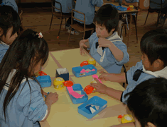 年中さんは、折り紙で、お内裏様とお雛様を作ります。 |