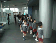 外は雪がまう肌寒い気温ですが、室内はとっても暖かく、すこし安心です。地下一階に荷物を置いて、 ロビー右のテラスで整列します。学芸員の方に案内されて、早速、鑑賞会場へ |