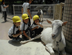 3クラスのなので、他のクラスは、羊や山羊を触ったり、 他の動物たちを見学したりとクラスごとに活動しました。 最初は、たんぽぽ組がモルモットを抱っこします。 |
