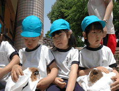 ふれあい動物広場に向かいます。 係りのお姉さんから動物に触れ合う時の3つの約束を聞いたあとで、 |