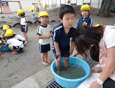 年少組、お砂場遊び。靴下をぬいだら、もうすっかりやる気まんまんです。
