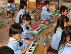 年長ひまわり組、「きらきら星」先生のピアノの伴奏にばっちりあわせて弾けます。