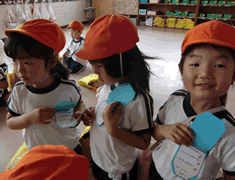 朝食を食べ終わると、みんなで椅子を教室に運びます。 教室でカバンから歯ブラシセットを出して、朝の歯磨きです。 |