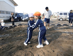 年長組は、餅つきの後、相撲大会がありました。ふかふかの砂の上で思いきり相撲をとって楽しい一時でした。 |