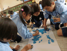 タンポを用いて、白い紙に「ポンポンポン」と青い絵の具を広げていきます。 |