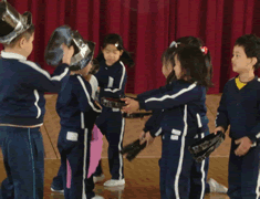 表現発表に向けて、どのクラスも熱が入ってきています。 少し停滞気味で、何度も同じ動きの確認をしていた日もありますが、ストーリーが展開していくにつれ、子ども達はとても楽しんで活動できるようになり、表情もとても豊かです。 仕上った場面まで、他クラスのお友達も見に来てくれて、暖かい拍手ももらえ、それがまた自信につながっているようです。 |