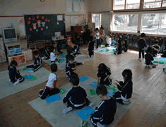 テレビの台の近くに全員を呼んで、これから粘土遊びをする旨を伝えます。 その間に、補助の先生が、粘土版をグループの人数毎に丸く並べていきます。 並び終わったのを確認して、 |
