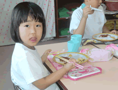 年長組のお友達、描画活動の準備をてきぱき。各自ですばやく用意をします。