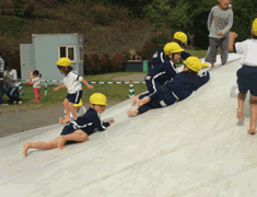 下を見ると、少し怖いけど、みんな反対側まで渡れました。 吊り橋から戻って、ふわふわドームで遊びました。 |