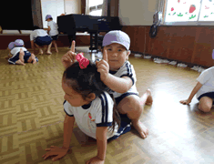 蒸し暑い一日でしたが、子ども達は、お遊戯室や園庭を使って体育活動を楽しみました。