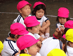 準備運動の後は、かけっこ。「位置について、よーい、どん!」