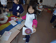 絵の具の容器の中でしゃぼん玉を作って画用紙に写し取ります。 出来上ったきれいな模様を見て嬉しそうなお友達。 |