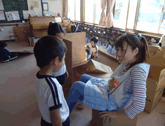 年長組です。 「先生、椅子ができたよ。座ってみて」先生が座ってみると「ありゃりゃ!これじゃ、危ないね」 椅子作りに再チャレンジです。 |