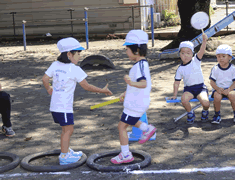 今日は、久しぶりの晴天の下園庭で思い切り運動あそびを行いました。 |
