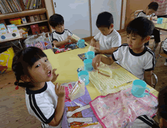 今日は、パン給食。お当番のお友だちがみんなにパンを配ります。 |