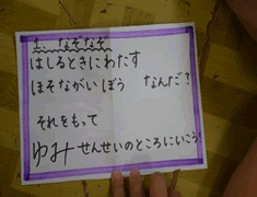 次は、ことばみつけゲームです。 6枚の言葉を見つけて、ことばを作るものです。上記の写真は、 「が、い、ほ、じゃ、り、も」 正解は、「じゃがいもほり」 これも見事にクリアーです。 |