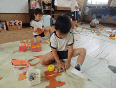 今日はお部屋では切ったり貼ったり、描いたり! 子ども達は思い思いの作品をつくりあげていました。 園庭では、毎日が運動会!体を動かして汗だくになりながら元気いっぱいの 子ども達でした♪ |