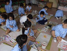 年長ひまわり組、絵の具で混色をした濃いグレーで丁寧に塗っていきます! 壁面のどの部分に使われるかは出来上ってからのお楽しみです! |