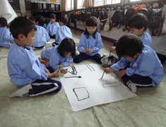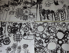 年中すみれ組は墨を使って大きな画用紙に「カメ」を描きました。 |