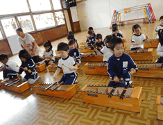 年中組はサウンドプレイとボックスホーンを行いました。 楽しくリズムに乗って体を動かしたり演奏しました。 |