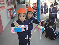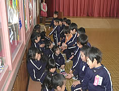 今日は大阪から講師の小谷先生がお越しになり、表現遊びのご指導をしていただきました。「園長先生のお友達?」「新しい先生?」と疑問を抱く子ども達。しかし、年長のある男の子は、昨年4月の小谷先生の来園をしっかりと覚えていたようで、小谷先生に「今日はリボン(蝶ネクタイ)していないね。」と聞いたそうです。小谷先生に助言をしていただくうちに、子ども達も自分の表現をいつも以上に出すことができたようです。同時に戸外では、担任が鬼に変身し、豆まきを行ないました。自分で作った三方を片手に、元気いっぱい鬼に向かって豆をまいていた子ども達でした。