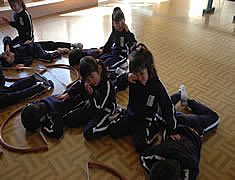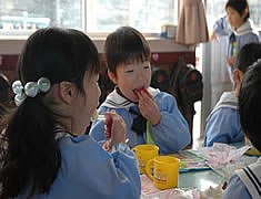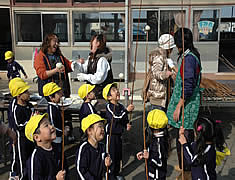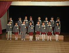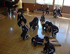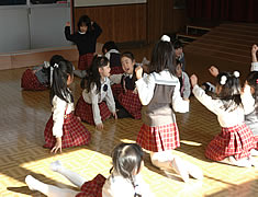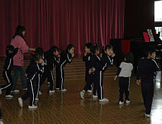1月は、表現発表会に向けての活動が多くなりましたが、こども達はとっても楽しんで、活動に参加していました。この活動では、こども達に、まず物語のあらすじを聞かせ、その場面を少しづつ作りながら次の場面へと進んでいきます。音楽を聞かせて、この場面は、こんなシーンだよ。「この音の時と、この音の時とは、このセリフ、どちらが言いやすいかな?」と子どもに音を聞いてもらいながら進めていきます。より具体的に言うならば、演奏の三要素(速度、強弱、音色)を基本において、実際に、ピアノのタッチやフレーズの切り方、強弱の入れ方、リズムを微妙に変えて、合図が単なる合図ではなくて、音楽的に処理ができるように配慮します。そしてリズム、メロディの変化を聞かせながら、どこだったら、台詞が言いやすいか、踊りやすいか、また、動きのシーンではどんなステップが場面に合うか・・・を子ども達と、まさに一つ一つ作り上げて進めていきます。ある程度、音楽にステップが合うようになったところで、役の表現をしてもらいます。例えば、「弓を引く」ところならば、実際に弓はどう引くか、何を撃つのか、どんな姿勢で引くとかっこいいか、標的はしっかり狙っているか、弓は軽いか、重いか、弦、腕はのびているか・・・それぞれに考えてもらいます。そして他の子と違う動きがあれば、それを、みんなの前で披露します。「A君は○○の表現ができている。すごいね。」「じゃ、他にできる人?」「はぁーい、」「じゃ、Bちゃんしてみて?」「Bちゃん、表現は、○○ですごいね」「他にもっと違うポーズができる人?」「はぁーい、先生、みてみて」・・・・・。こども達は、認められることで、様々な表現を出してくれました。そうして、その役になりきってくれました。秘密の花園のメアリーの泣く場面など、とっても上手に表現できていました。そして足のステップ(スキップや歩く、サイドギャロップ・・)などは、一緒に合わせないと、音楽とのバランスが崩れてしまいますので、その約束は守りながら、足から上の動きは、それぞれが他とは違う個性を尊重した表現を担任も要求して進めてきました。宝を気付かれないように忍び足でとりに行くシーンでも、こどもなりにその場面が十分に理解できていれば、いろいろな体勢(指で”シー”と言いながら)近づくことができます。台詞が合わなければ、音楽を変えて、その都度訂正しながらの進めます。まさに先生と子ども達が共に協力し、考え、お互いの表現を認めての表現遊び活動でした。こども達の表情は、先生から”こうしなさい”と言われたものではなく、”自分で表情を考えて表現した”ところに、今回の一番大切な、表現遊びのテーマがありました。