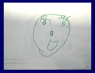 「すごい大きなバナナを描いたんだね。」と聞くと、「だって大好きなんだもん!」と言ってました。アレ!?あまり好きではなかったはずなのに・・・いつの間に好きになったのかしら?それに好んで食べるわけでもなかったのに・・・じゃぁ食べて!とバナナを渡すと一口食べ「もういい・・・。」やっぱり!と思いながらどうしてバナナをかいたんだろうと考えてみると前日に家族でバナナを好きか嫌いかで話をしていたのを覚えていたんだと気づきました。ちなみに私(母)と長女はキライでたべません!その時もあつきは「好きだよ〜」と言ってました!(年中) |