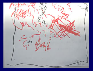 「幼稚園で遊んだの。お外で遊んだんだよ。ポツポツが子どもで、棒が木で、点は砂場。」