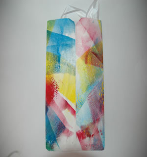 11月15日に七五三の飴を入れて持ち帰った七五三の袋です。 版画用インクをローラーでのばし、奉書紙(和紙)に技法遊びを実施しました。 その後に年長は墨とクレパスで描きました。 色彩的にもとってもきれいに仕上がりました。 年中は、折り紙で服を折り、顔をクレパスで描きました。想いのある作品に仕上がりました。 年少は、ローラーの技法を主に行いました。 段ボールや、ゴム、葉っぱの模様が浮き出てくる技法遊びに、こども達もとっても不思議がっていました。