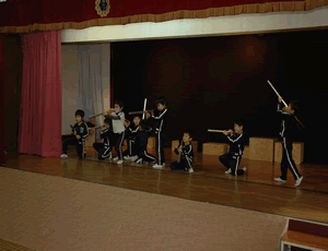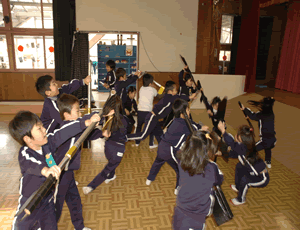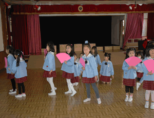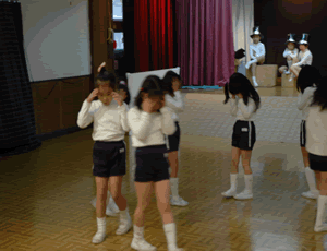 音楽にステップを合わせ、楽しそうにダンスをしている。 |
