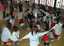 みんなは池の中の鯉だよ。先生達は水になるよ。 |