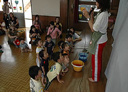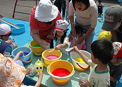 さぁ、これから外で色水遊びをするよ。みんな集まって下さい。 |