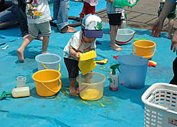 じょうろで水車を回すのも楽しいね。タライは色水でいっぱいに・・・。 |